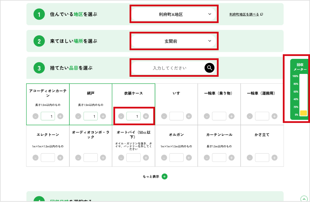 排出量の限度を回収メーターで確認しながら、捨てたい品目の数量を設定します。