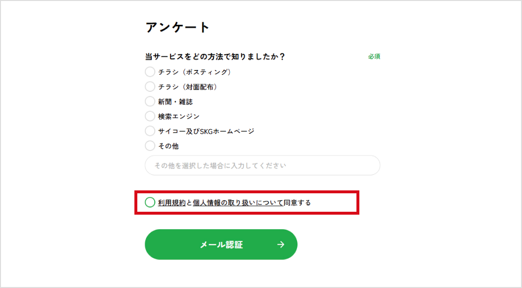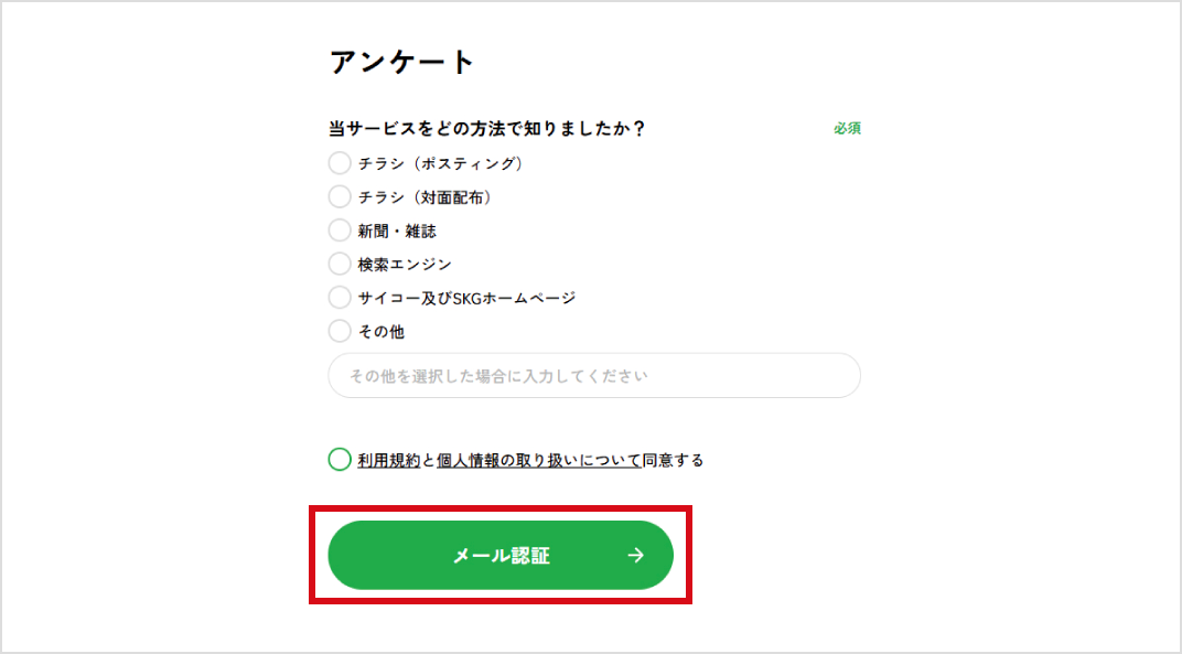 入力いただいたメールアドレスに認証メールをお送りいたします。メールに記載されたURLをクリックいただき会員登録完了となります。