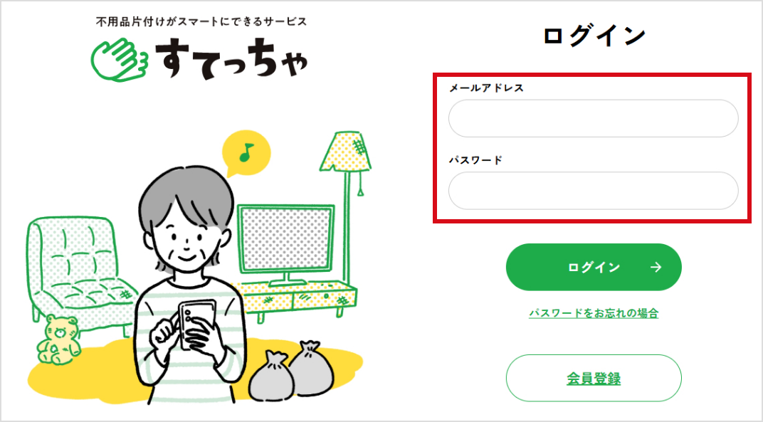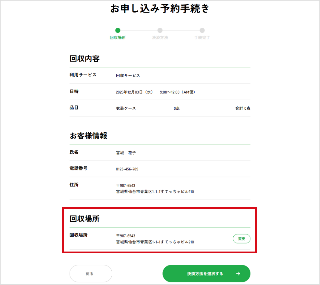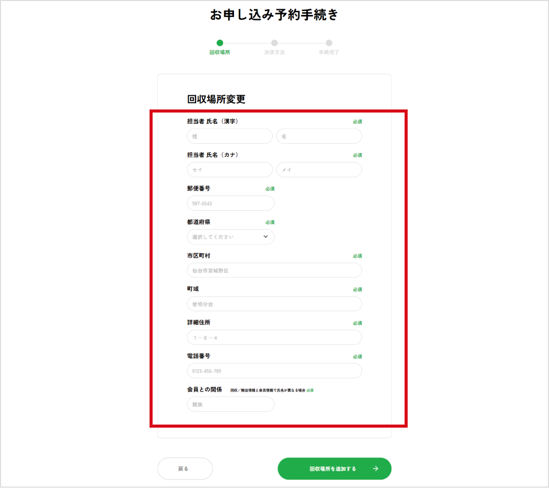 会員情報に記載された住所が表示されますが、捨てたいものが別の場所に保管されている場合は引取場所の住所に変更をしてください。